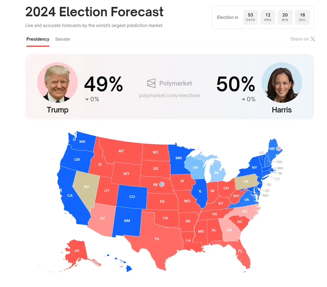 真正让 Polymarket 爆火的则是今年美国最热门的总统大选事件。特朗普遇刺之后的胜选率、拜登退选率、哈里斯参与竞选之后的胜选率在不断地各类声明、辩论中引起数据的变化波动。